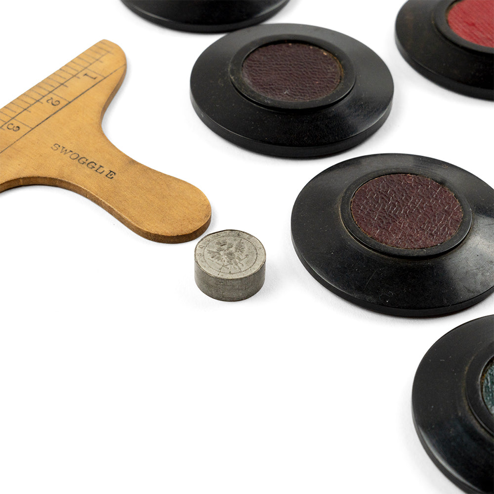 Inside, you will find four ebony squails in various colours and four boxwood squails, all in superb condition. The set also includes a measuring ruler for accuracy, as well as a pewter squail jack from 1839, ensuring that all components are original and true to the period.