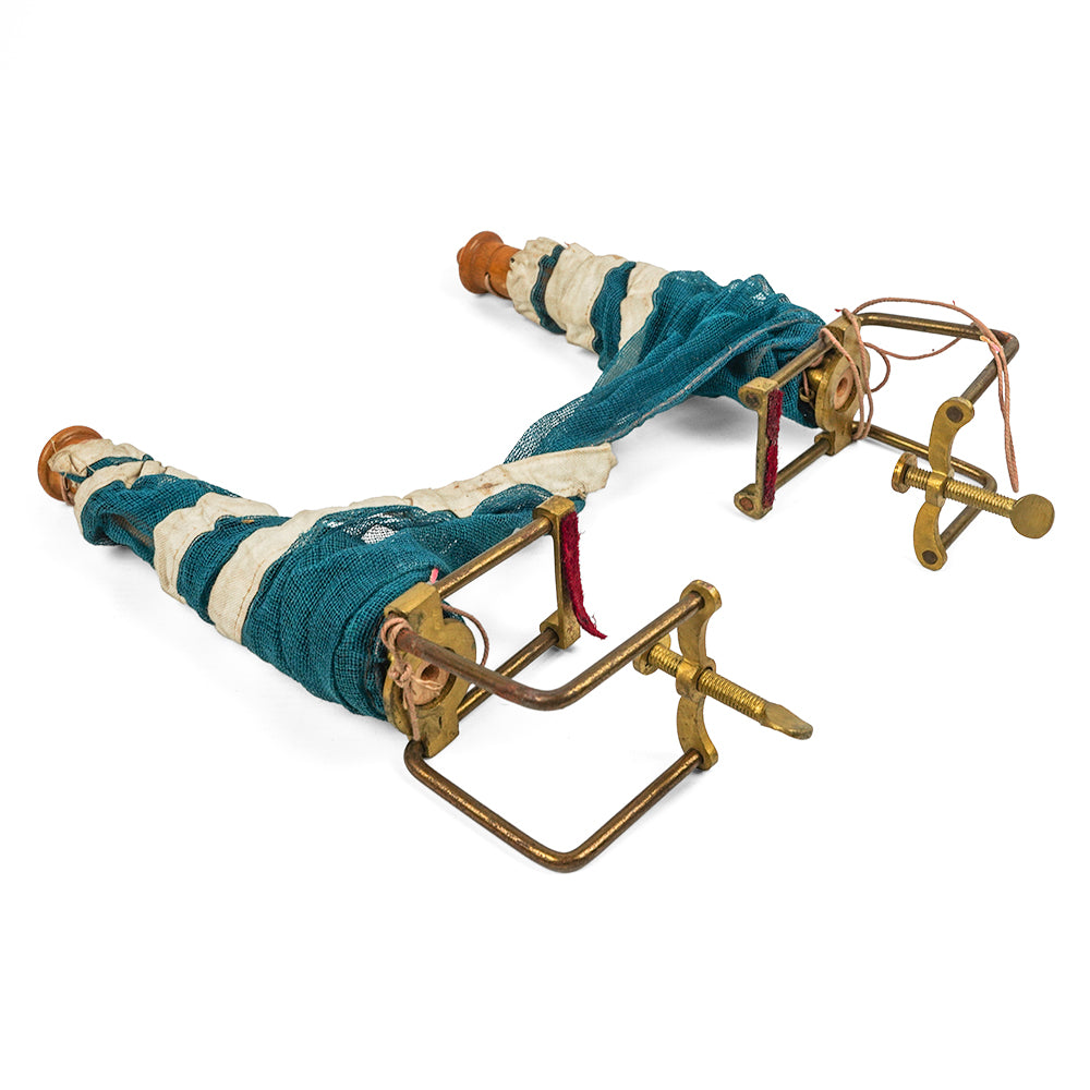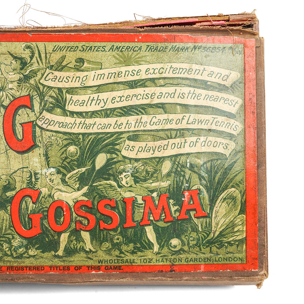 The set comes in the original box with two bats, a mesh net which attaches to two wooden posts compete with metal clamps for fixing to a table. A book of rules and directions is also included - newer print. The Bats use a solid wooden frame and handle and are steam bent. Finally they are covered with the finest grade vellum which is glued and hand stitched into place. A contemporary spare all-wooden bat is included signed by the original 1901 owner, Robert Cooper.