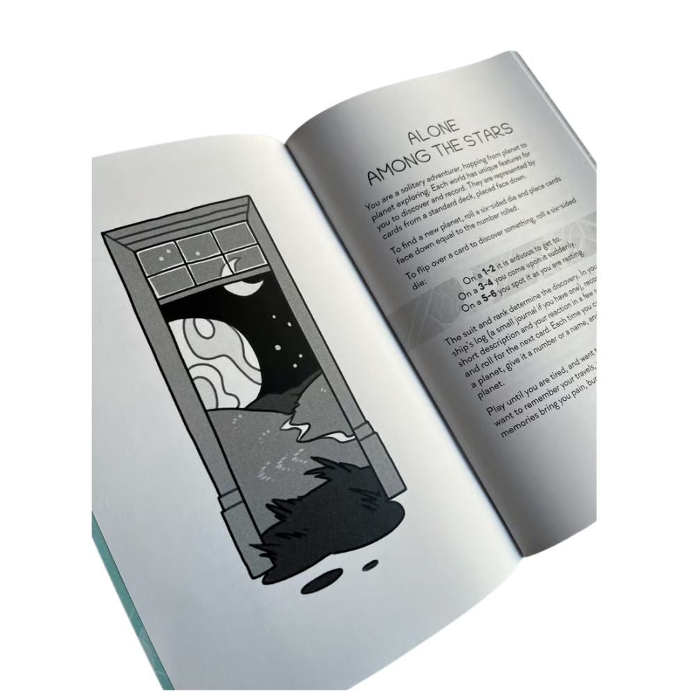 Designed for solo play, these games transform simple tools into powerful storytelling engines. With just a journal, a pen, a six-sided die, and a standard deck of cards, you’ll generate evocative prompts that guide your journey into mysterious and unforgettable worlds.