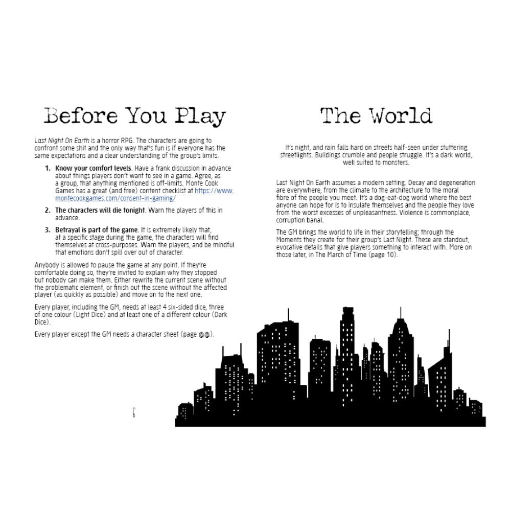 Step into the shoes of a character on the brink of transformation in Last Night On Earth, a modern horror role-playing game designed for one-shot sessions with 2 to 4 players. Utilizing the Trophy rule set, this 32-page booklet provides everything you need to play, except for a handful of six-sided dice. A sample scenario is included to get you started quickly.