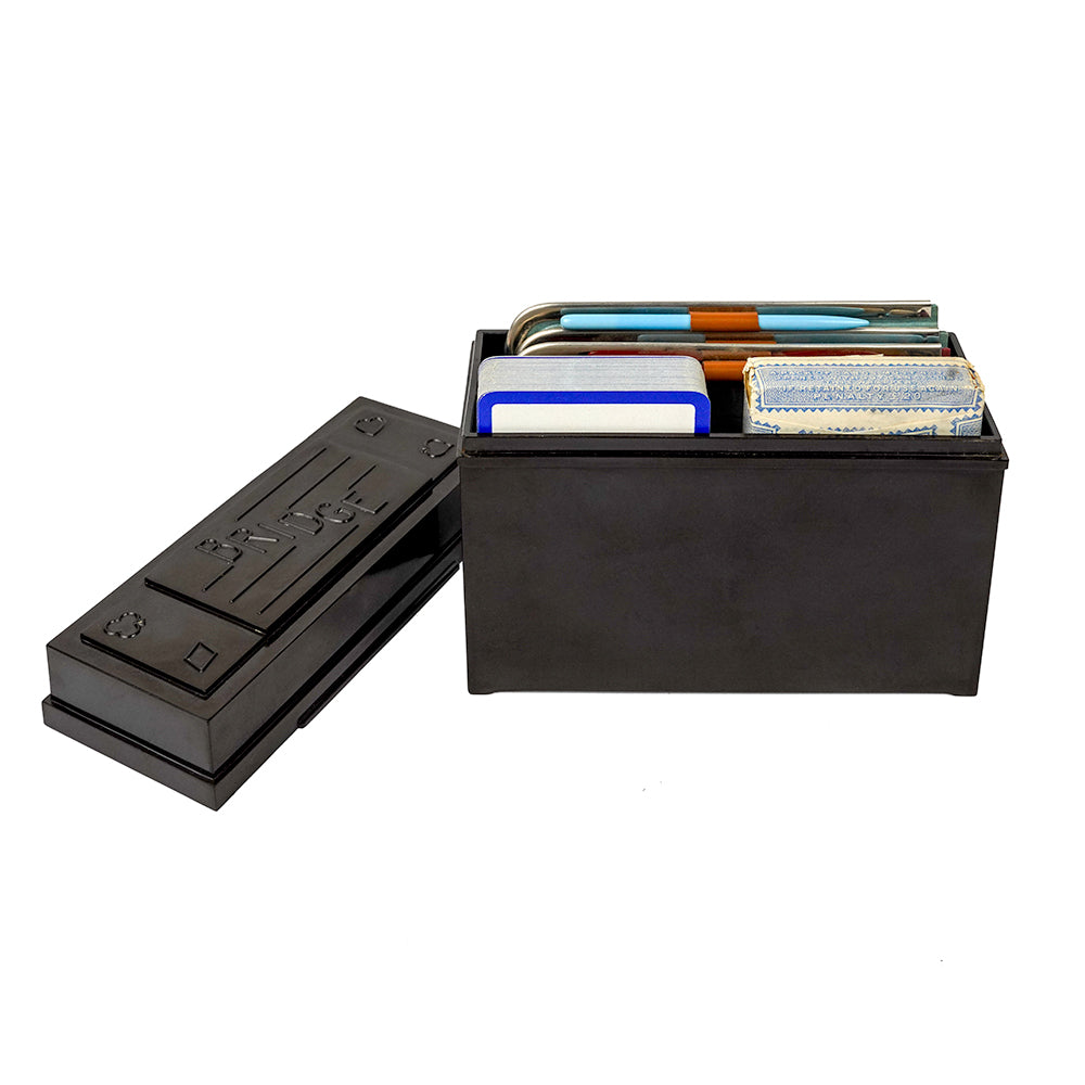 It took a lot of digging to find the origins behind this unique bridge set. As far as we could make out the bridge case and the elements inside were produced by two different makers. The brown bakelite box was made by Seaforth Plastics based out of Southend on Sea during the 1930/40s whom we found multiple references for their logo online and via the Museum of Design in Plastics in Bournemouth.