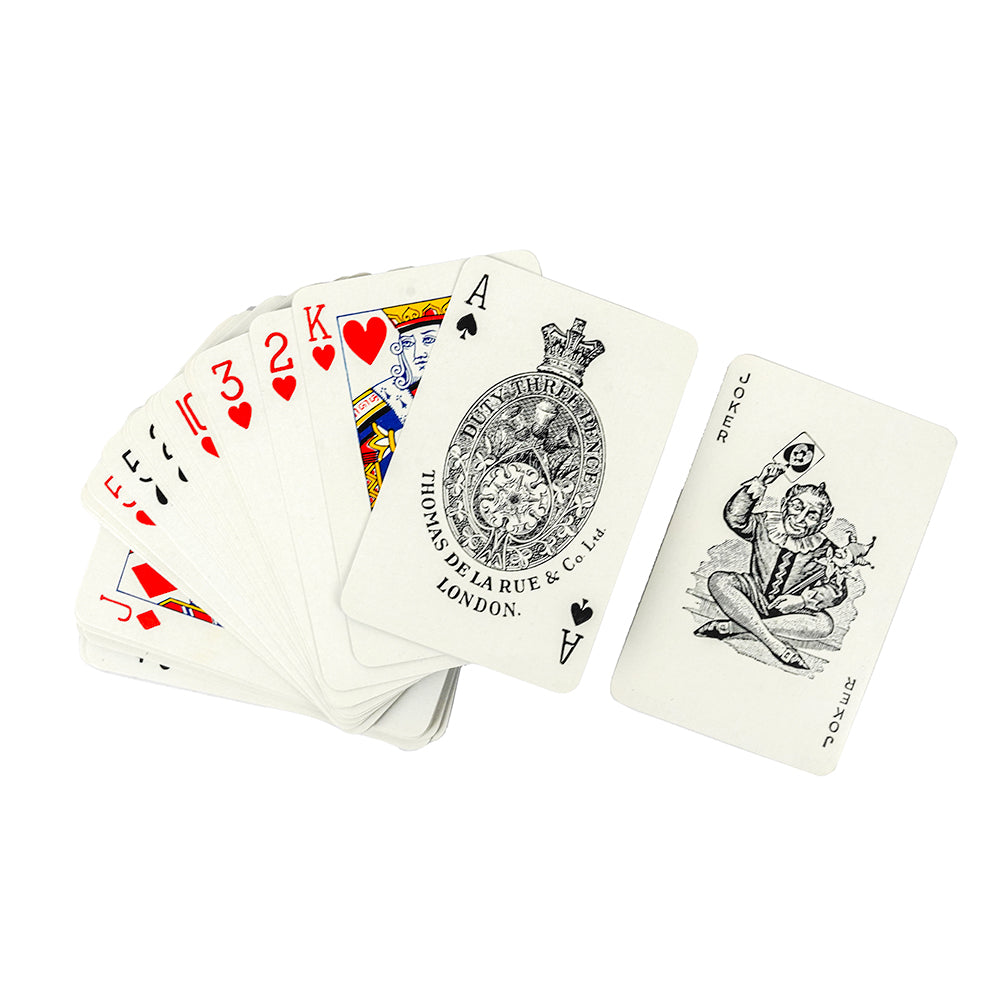 The playing cards were made by famous printer and stationer De la Rue who were based out of London at the time and would have likely made the decks in partnership with Seaforth plastics (their logo can be seen on the backs of the cards). One deck of cards is still in its original 1930s tax wrapper!