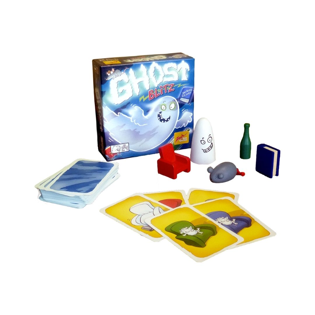 Ghost Blitz is a fast paced dexterity and brain-bending game! With astonishingly simple rules, it's surprisingly mind-boggling to play. With five small objects, in five different colours, your task is to be the first to grab the one that doesn't appear on the card just laid down - and doesn't have the same colour as any of the images on the card either! Surprisingly good fun, highly recommend.