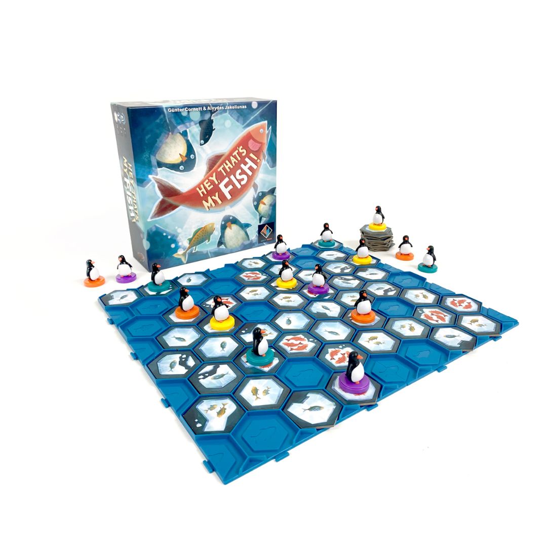 In Hey, That’s My Fish!, players control penguins scrambling across a rapidly shrinking ice floe to catch fish. Each turn, players move their penguins across hexagonal ice tiles, collecting fish as they go. The challenge lies in moving strategically to trap your opponents while grabbing the most fish before the ice melts away. Quick to learn, but with deep tactical play, it’s perfect for families and casual gamers alike.