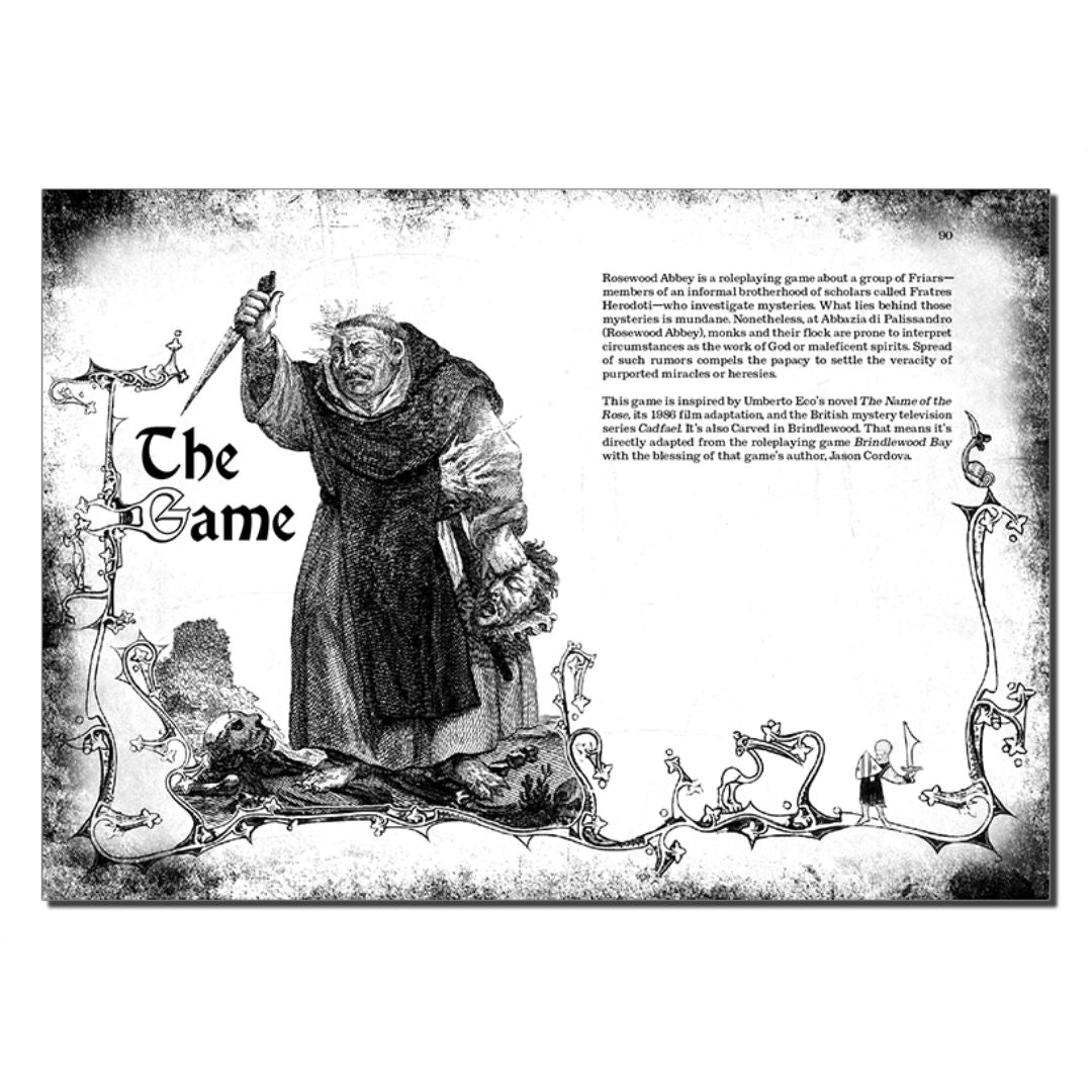 In Rosewood Abbey, 3 to 6 players assume the roles of the Fratres Herodoti, an informal brotherhood of scholars sworn to knowledge and truth. Set within the Abbazia di Palissandro, the monks investigate mysteries that, while often mundane, are prone to being misinterpreted by others as divine or malevolent acts. As rumors escalate, the papacy demands clarity on alleged miracles or heresies. Players must navigate these challenges, deciding whether to uphold their oath amidst growing tension.