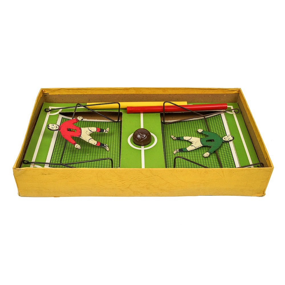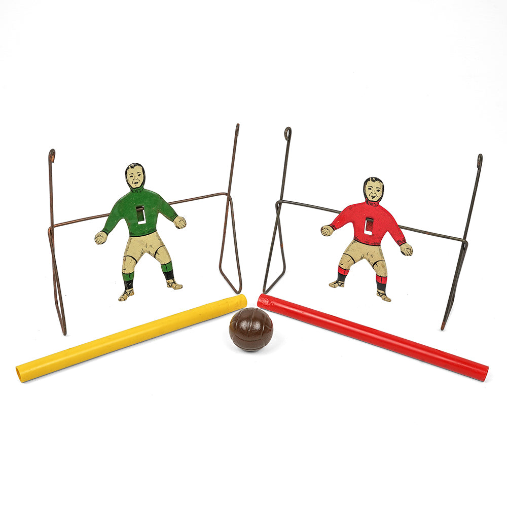 This late 1930s boxed children's Blow Football by Chad Valley Games is a real relic of the art deco period. A great collectible for the football mad fan or toy collector, it comes with two tinplate goalkeepers, a plastic football, 3 blowing straws and two freestanding metal goal posts.