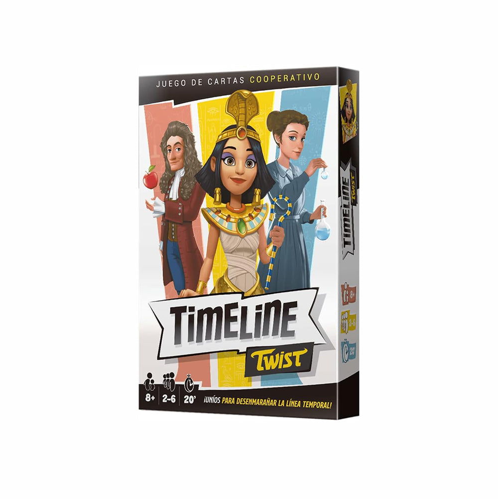 Timeline Twist is a new version of the popular Timeline game. Each game is now a cooperative challenge, but you don't have to be a history buff to play! In this new edition, players team up, communicate and coordinate to find the best strategy to play all 36 cards in the game.