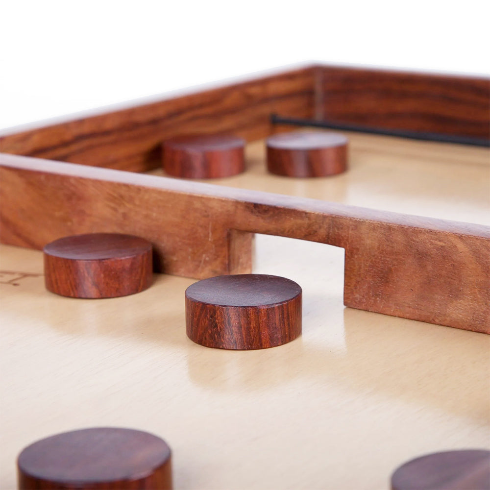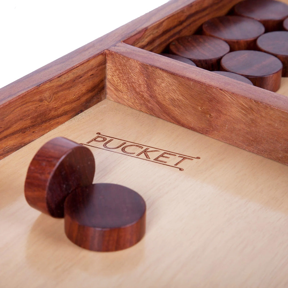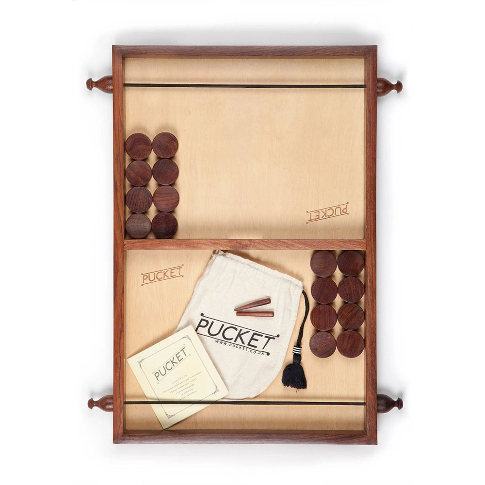 Pucket wooden games are hand-crafted in India from sheesham wood.