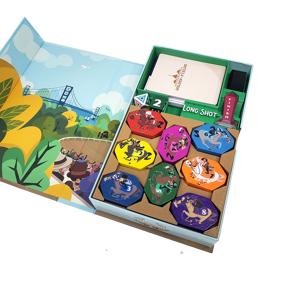 In Long Shot: The Dice Game, you and up to eight players will strategize and push your luck as the action unfolds in a tense race of eight horses. During the game you buy horses, place bets, influence race movement, and utilize special abilities. The roll of the dice determines which horses move and the options available each turn, so be ready to adapt your plans. Once three horses cross the finish line, earnings are totaled. While there are many ways to earn money during a horse race, only the player that makes the most money will be declared the winner. Will you play it safe, or risk it big on a long shot?