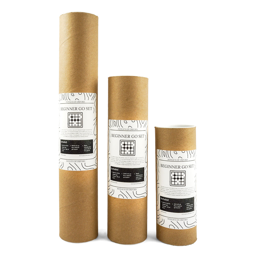 These sets come in three sizes and include a roll up faux leather board, plastic black and white stones and an instruction booklet.