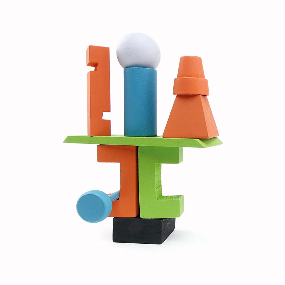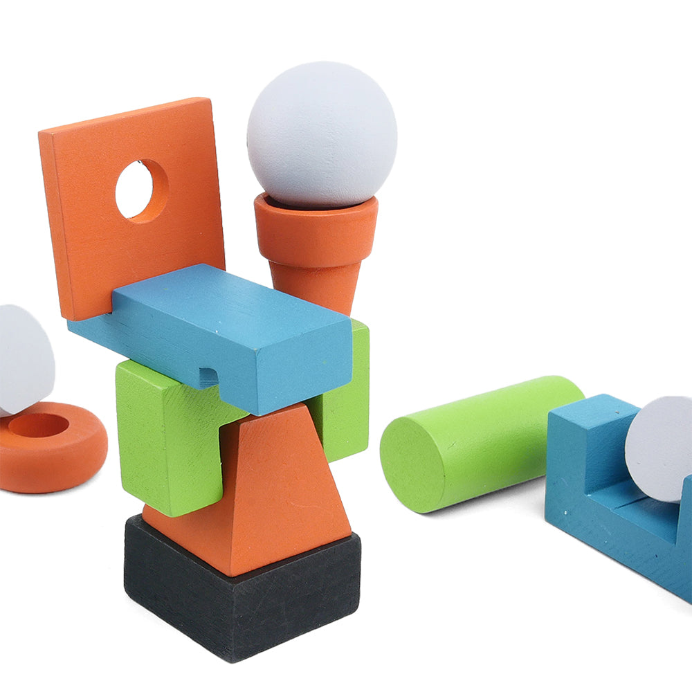 Junk Art contains more than ten game modes, along with more than sixty big colourful wooden components. In one version of the game, players pile all of the wooden parts in the centre of the table, then are dealt a number of cards, with each card depicting one of these parts. On a turn, a player presents their left-hand neighbour with two cards from their hand. This neighbour takes one card in hand, then takes the part shown on the other card and places it on their base or on other parts that they've already placed. If something falls, it stays on the table and the player continues to build on whatever still stands. Once players have finished playing cards, whoever has the tallest work of art wins.
