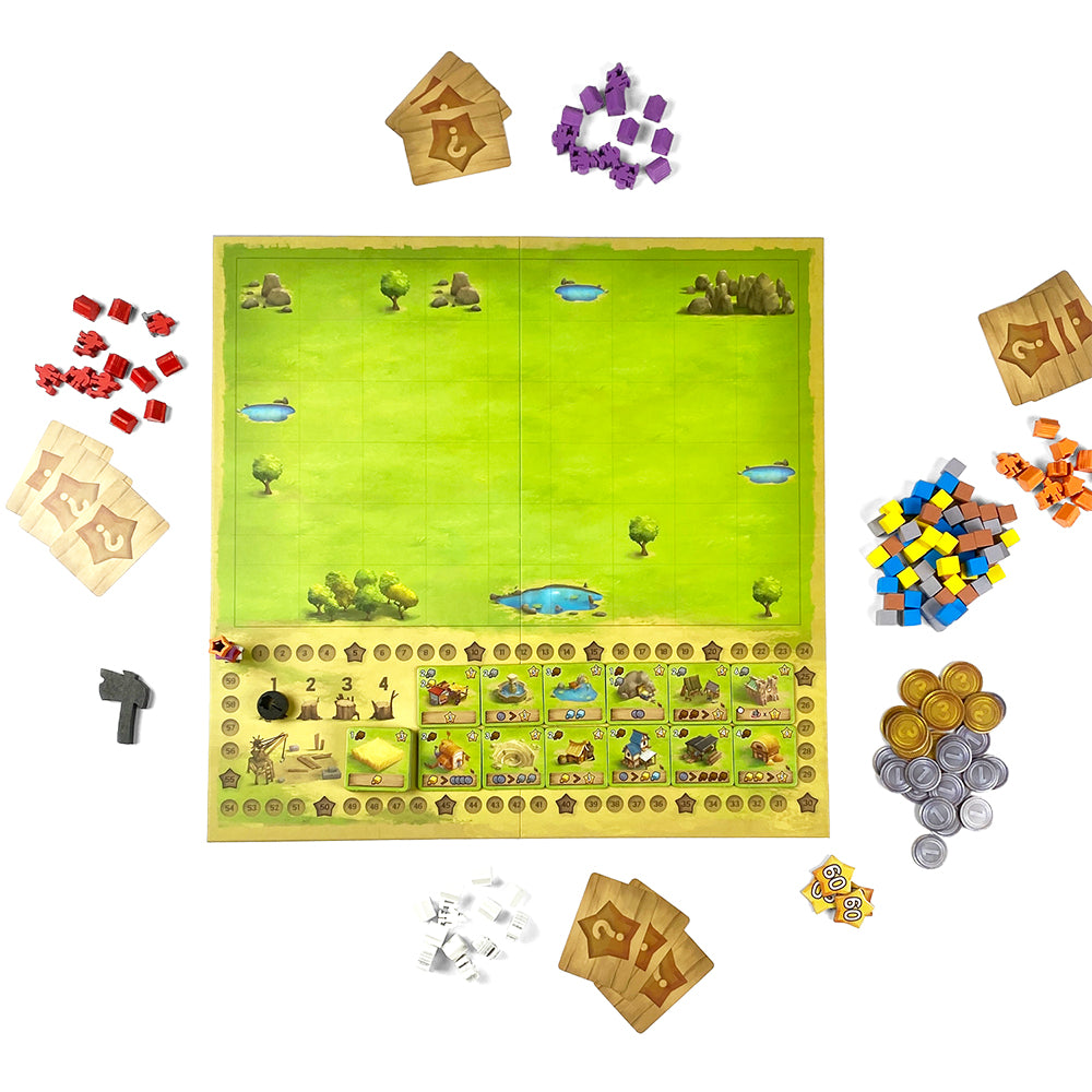 In the game, which lasts four rounds, you can acquire resources such as wood, stones, fish, and wheat from the surrounding squares by putting workers on the board, with three workers being placed each round. When you place a worker, you acquire the resources available in all eight surrounding spaces. You can build buildings by using these resources, and you or any other player can gain the effect of the building when place a worker next to it; if you place next to a building owned by another, however, you must pay them a coin before you can collect those resources.