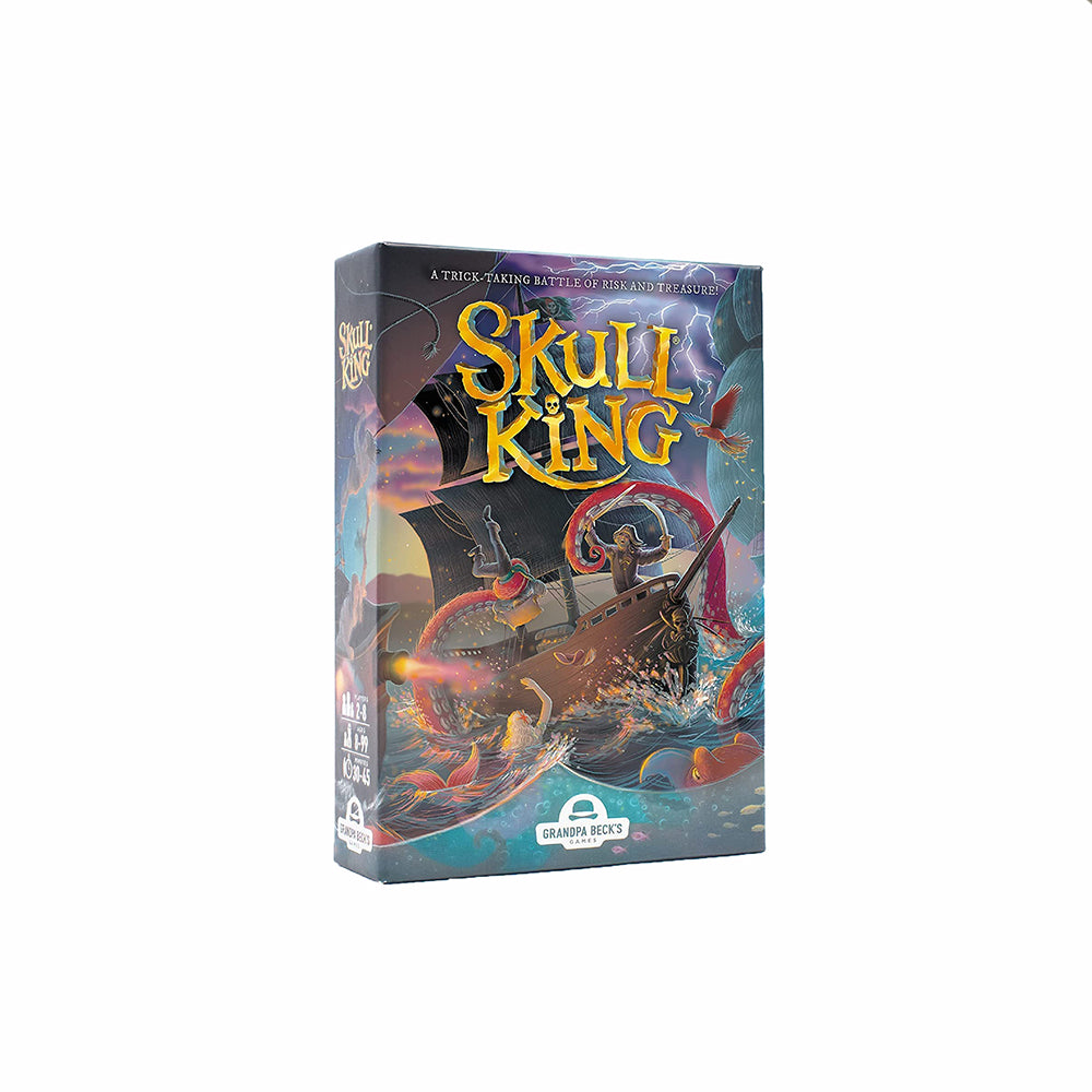 A fast-paced trick-taking game with a pirate twist. Bid each round on how many tricks you’ll win. Watch out! Mermaids, pirates, the notorious Skull King, and the new White Whale and Kraken cards add to the adventure! Bid correctly, and you’ll gain points—bid wrong, and it’s Davy Jones’ locker for you!