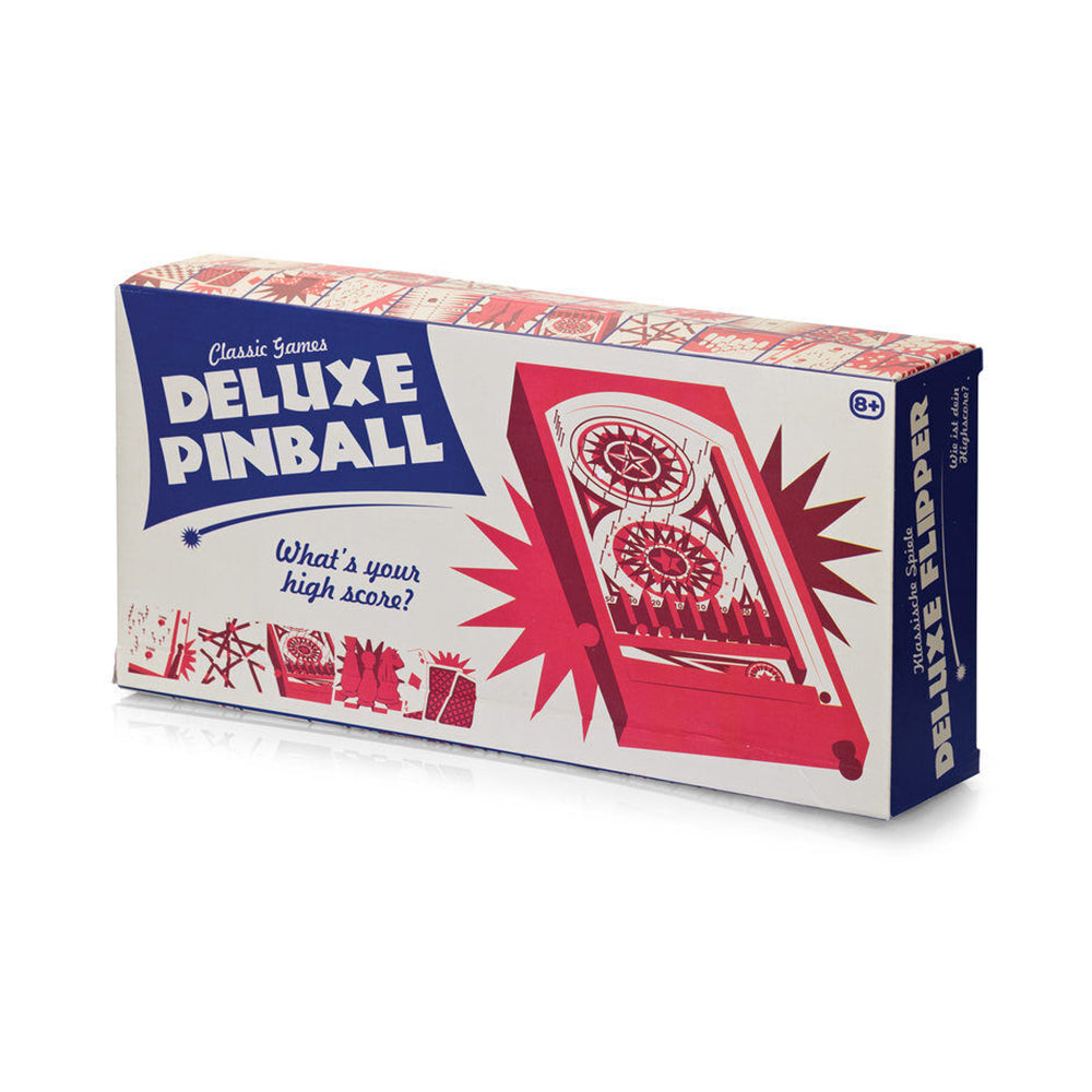 Wooden pinball game with spring launcher and metal pins to direct the balls as they fall. When pulled and released the handle launches one of the ball bearings up and onto the game board where it tumbles through the pins to land in one of the scoring zones at the bottom. Once all balls have been launched the recovery rail slides out and returns all balls to the launch queue.