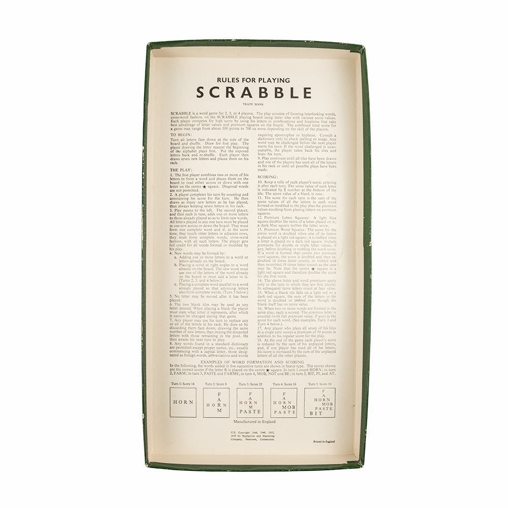 A classic edition of Scrabble from the 1960s, manufactured by JW Spear & Sons Ltd of Enfield, Middlesex, England.