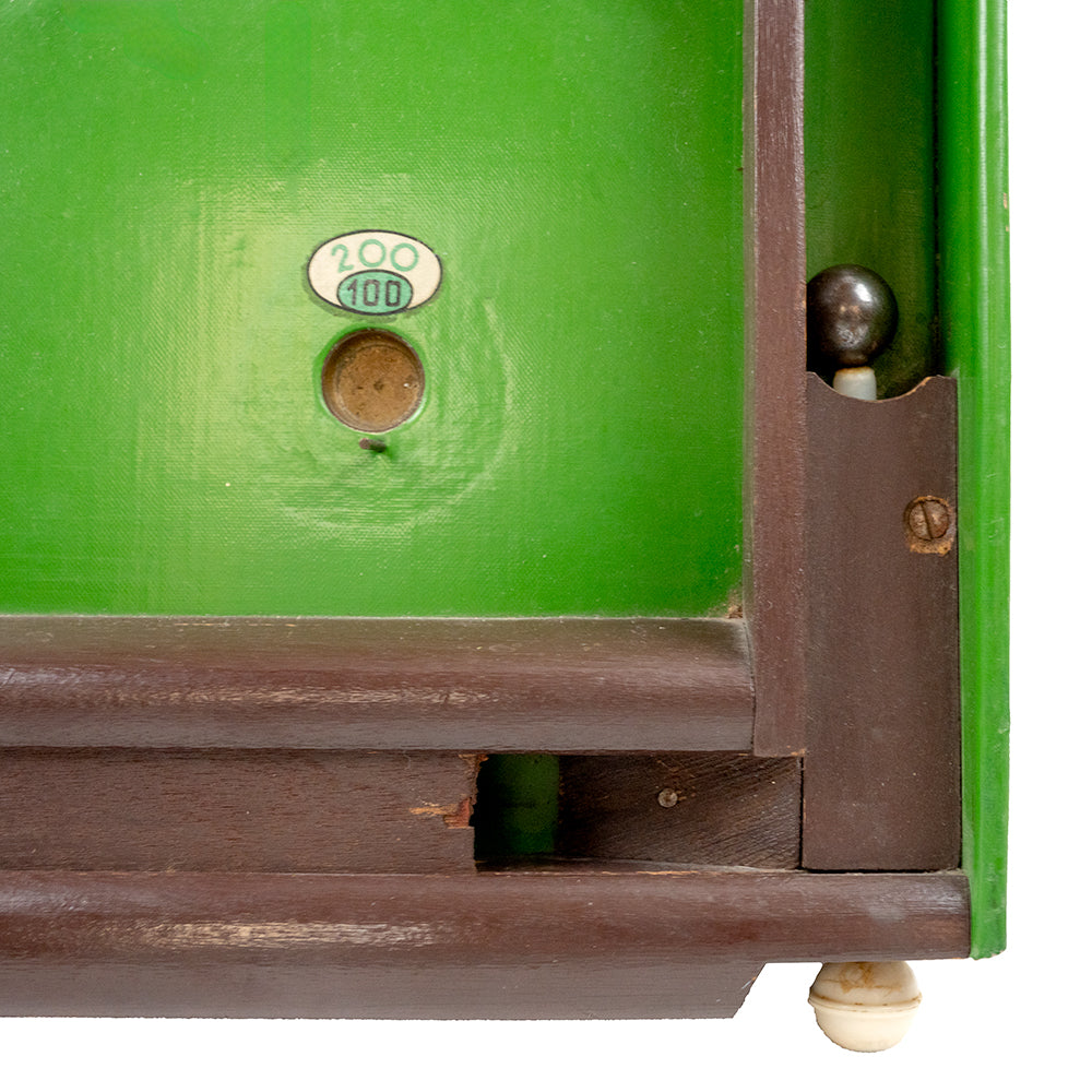 The paintwork is nearly flawless, and it features a spring-loaded pusher and original hinged adjusters at the bottom. It comes with a full set of ten original steel balls stored in a slide compartment. All pins are original and securely in place, and there is a unique ramp that allows players to increase their top score to 2000.