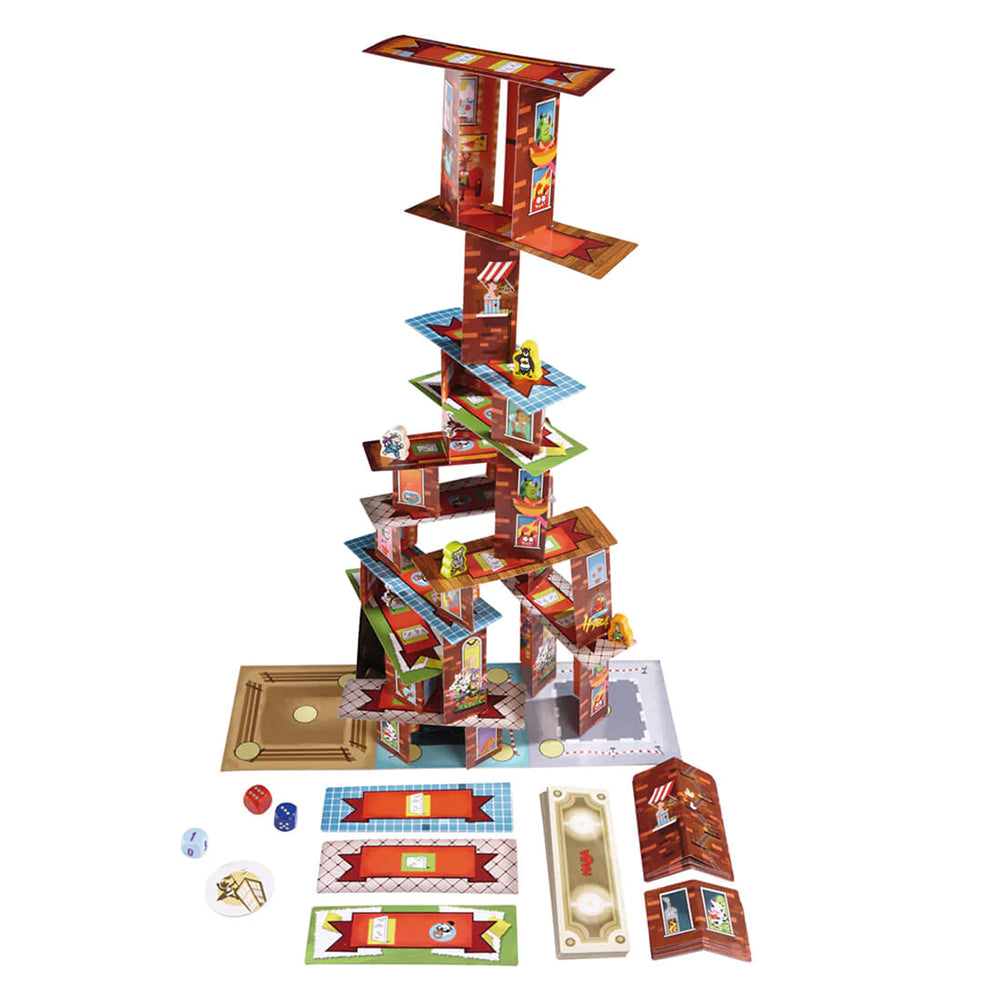 Rhino Hero and his super hero friends have all sorts of adventures on the card skyscraper. But be careful: it gets higher and more wobbly as more cards are used to build walls and floors. Players who have luck with the dice move their own super hero high up, and defend their spot against other players in dice battles ... if only there weren't the spider monkeys who make the skyscraper sway.