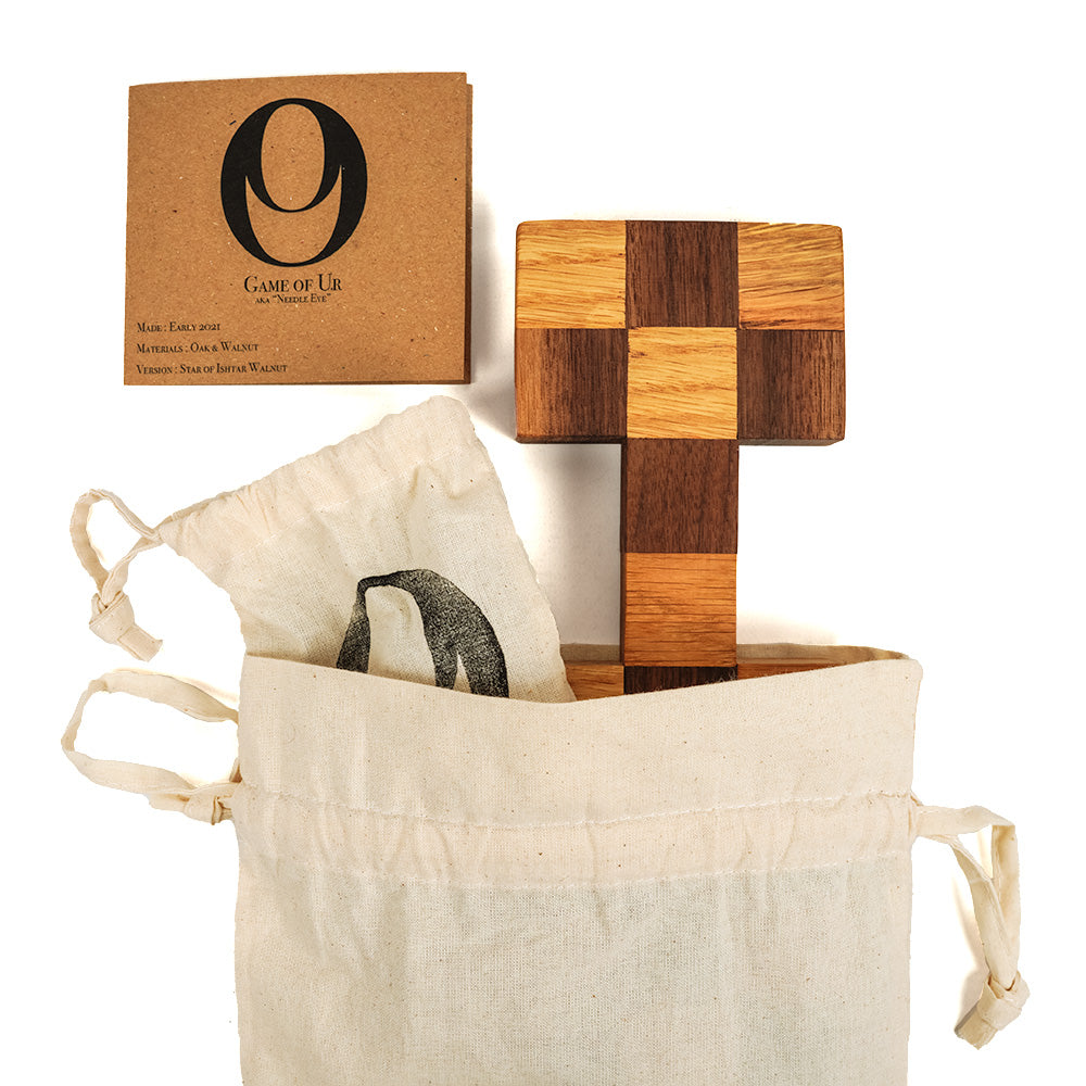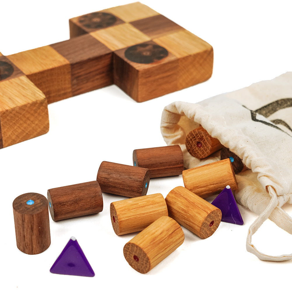 A beautifully crafted 'Royal Game of Ur', made from solid oak and walnut wood, complemented by circular totems (seven walnut and seven oak hand embellished with red and blue painted pips). The symbols on the board draw inspiration from the Sumerian Goddess, Star of Ishtar. Branded by hand, they symbolise safety for the totem that lands on it (also granting the player another role of the dice).