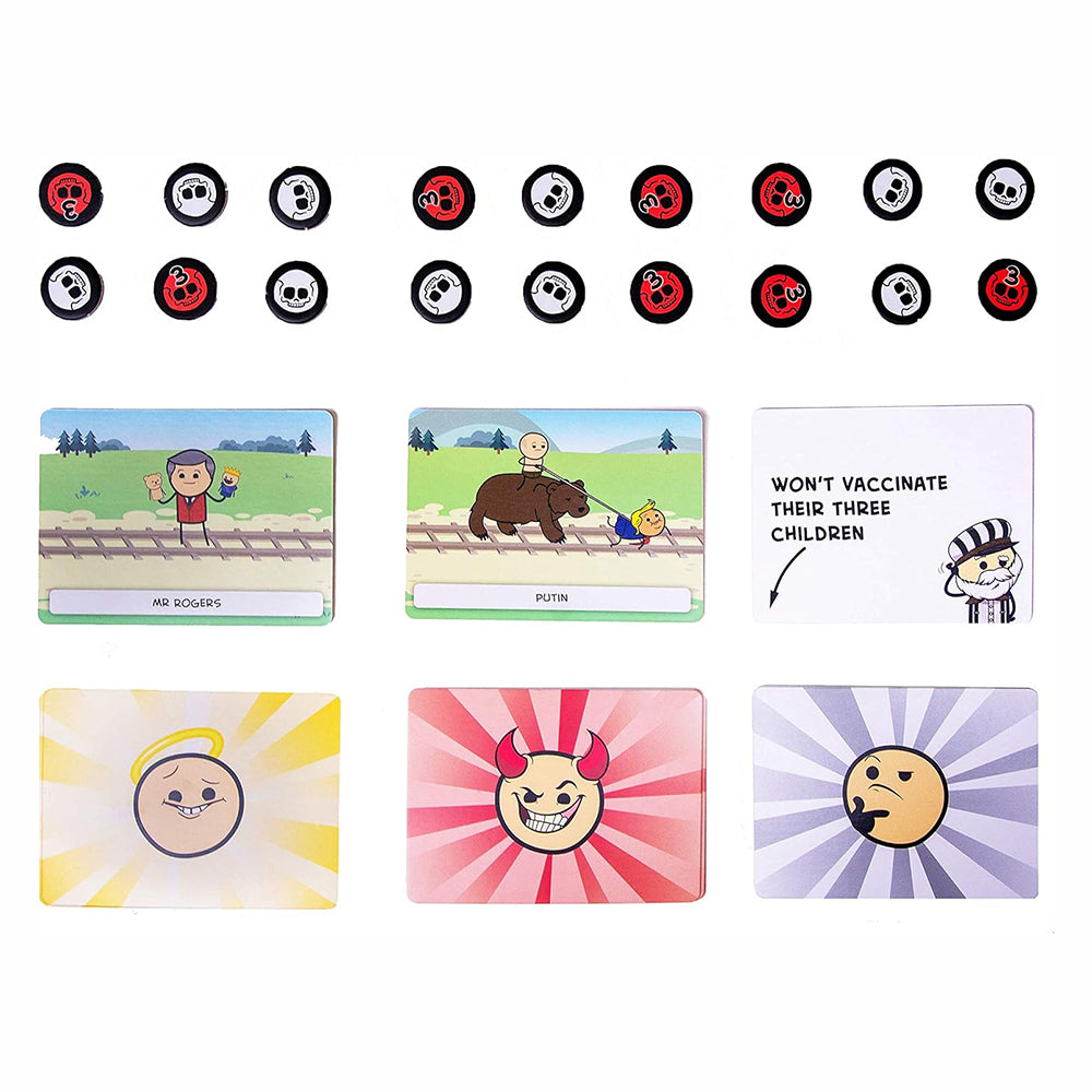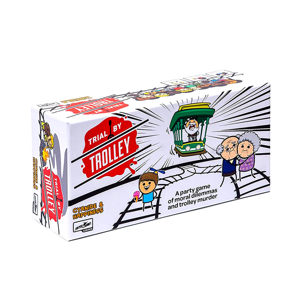 A party game of moral dilemmas and Trolley Murder. One player is the conductor and must send an out-of-control trolley down one of two tracks, crushing everything in its path. Everyone else splits into two teams and tries to convince the conductor to spare everyone on their track and kill everyone on the other track!