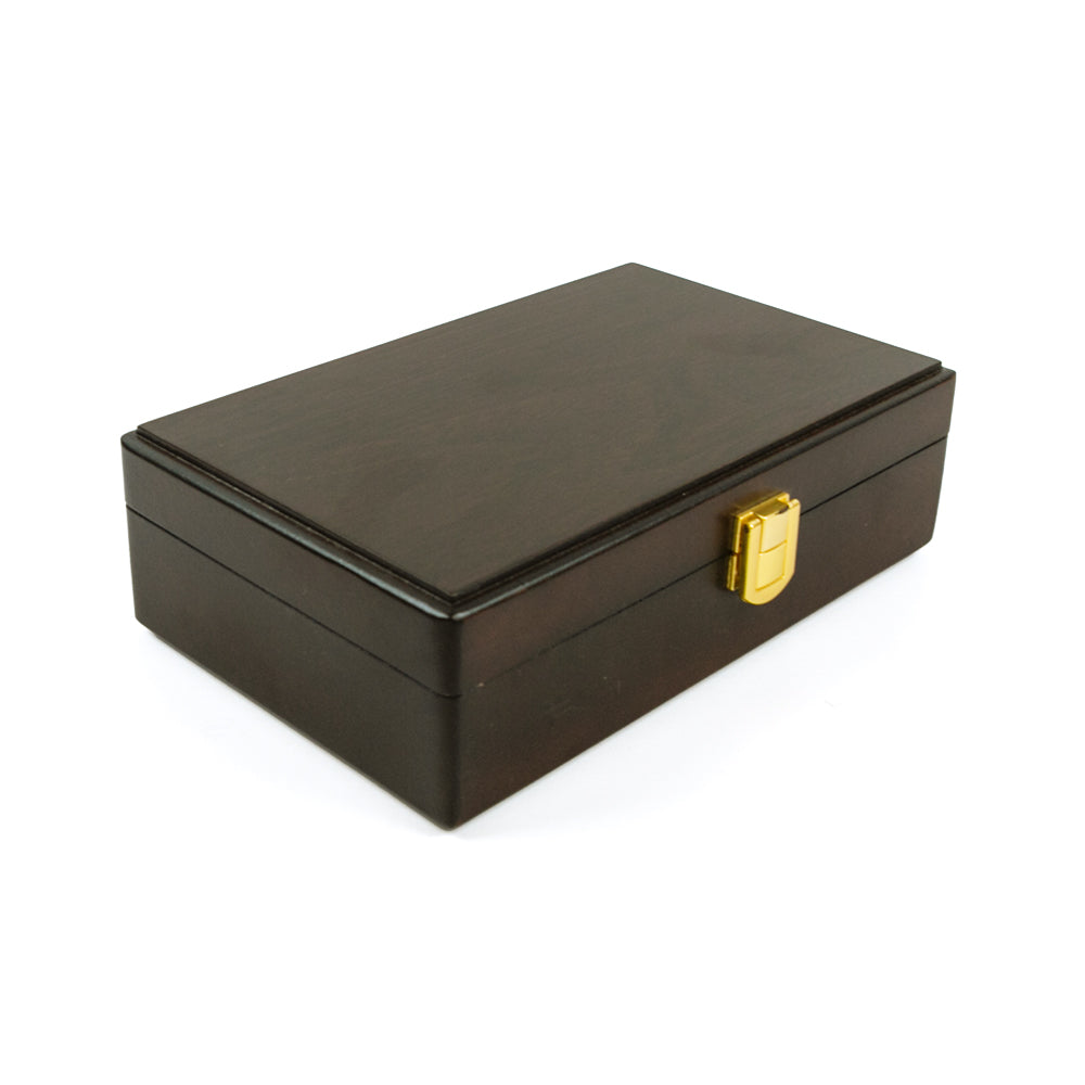 55 acrylic 9x9 dominoes presented in a walnut-style wooden hinged box with clasp fastening. Box dimensions measure 20 x 12.5 x 6cm.