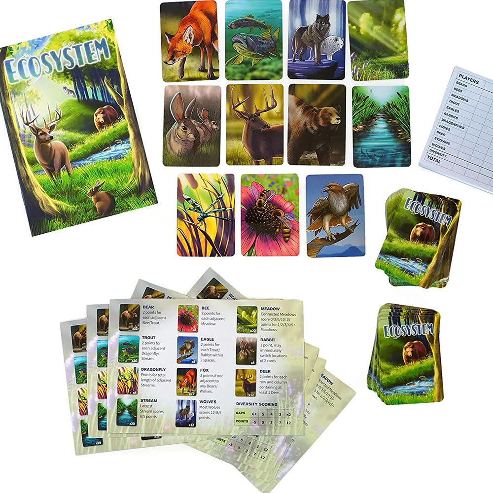Ecosystem is a card-drafting game in which players choose cards and place them into their play area turn by turn. The cards in a player's grid make up their own personal ecosystem, and at game's end, a player will have twenty cards in their ecosystem, with the game including eleven types of cards. Bears score by being placed next to bees and trout; trout score by being placed next to streams and dragonflies; and streams are compared at the end of the game, with the player who has the largest stream earning points. These are just a few examples of how scoring works in Ecosystem. Don't forget to diversify!