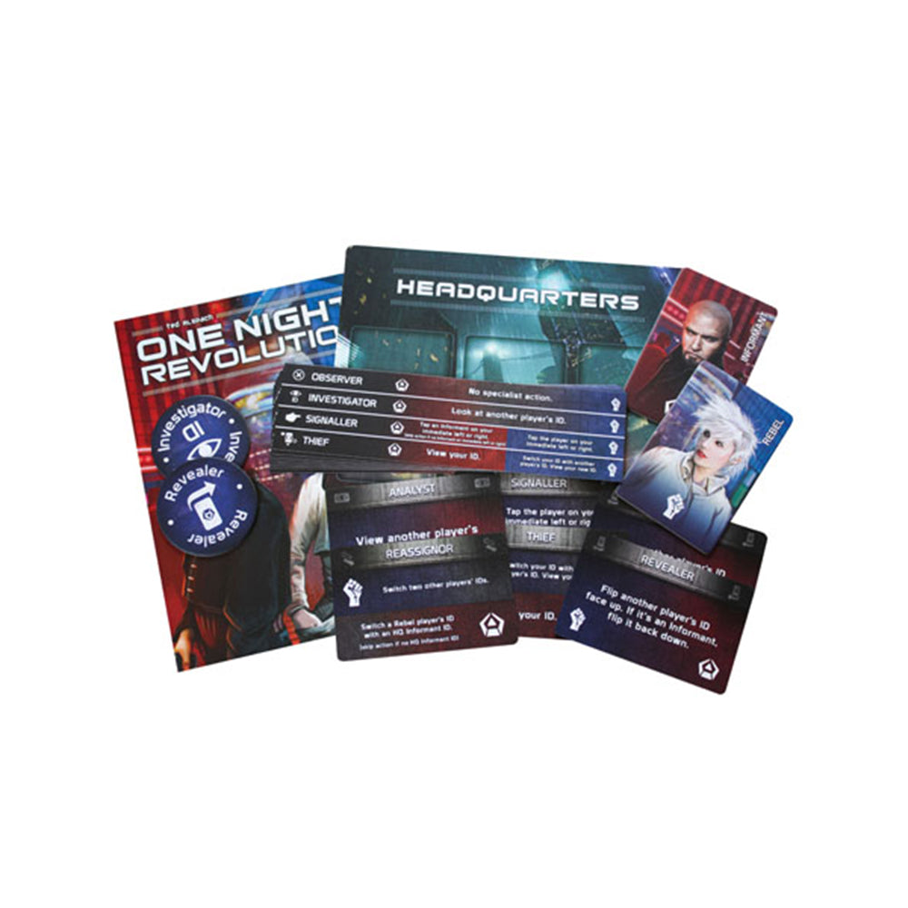 One Night Revolution is a super fast game of secret identities for 3 to 10 players that combines all the deductive and chaotically fun elements of the One Night Ultimate Werewolf series with more structured game play. The result is a very addictive game that is easy to learn and will be played over and over again.