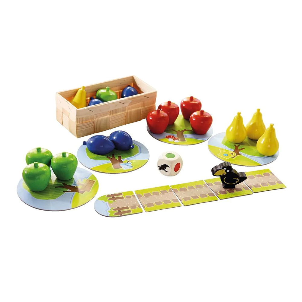 My First Orchard. Can the children harvest the hearty fruit from the orchard and place them in the basket before the raven reaches the end of the trail? Only lucky rolls of the large wooden dice will tell. Game includes solid wooden apples, pears and plums which are also suitable for free play. A co-operative game designed particularly for small children's hands.