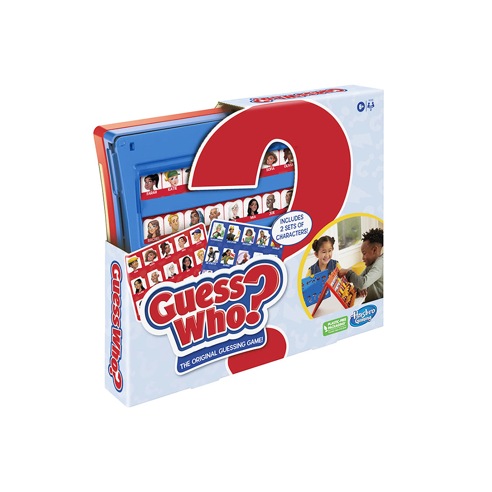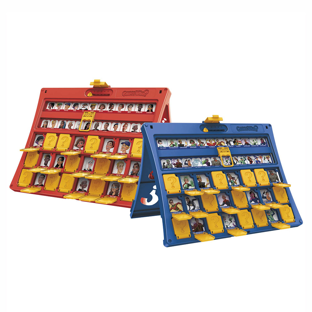 Choose the red board or the blue, and pick a mystery Guess Who? character. Players take turns asking yes or no questions to try and name their opponent’s mystery character. Do they have a beard? Brown eyes? What about a hat?