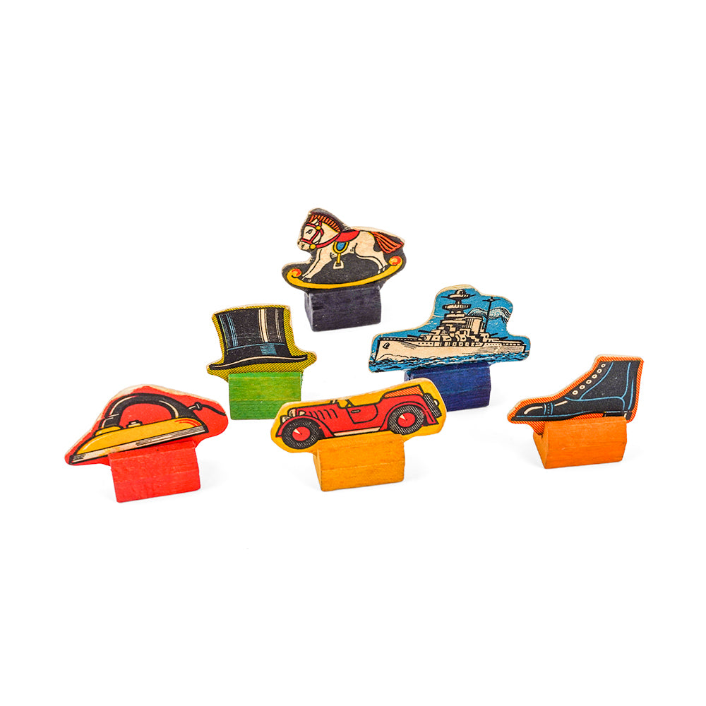 These sets in question date back to the 1950s with post wartime playing pieces with colourful bases which were made with cardboard rather than metal and the box and board are separate.