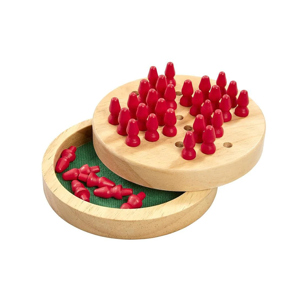 This travel version has been carefully crafted from reforested rubberwood and green felt, 34 red wooden pegs. The forest-friendly wood is durable and provides a superior finish. The board is made from two circular pieces of finished wooden that are hinged together, allowing for the pieces to be securely stored inside.