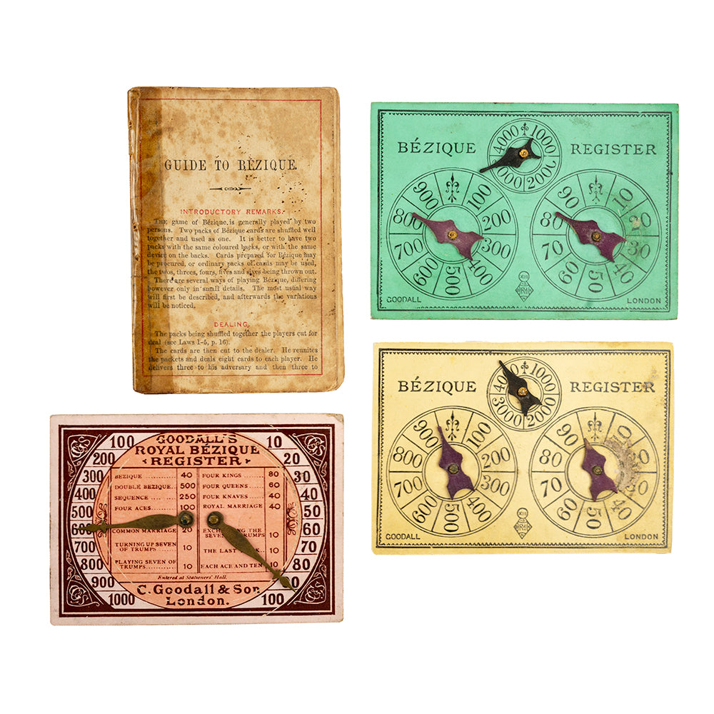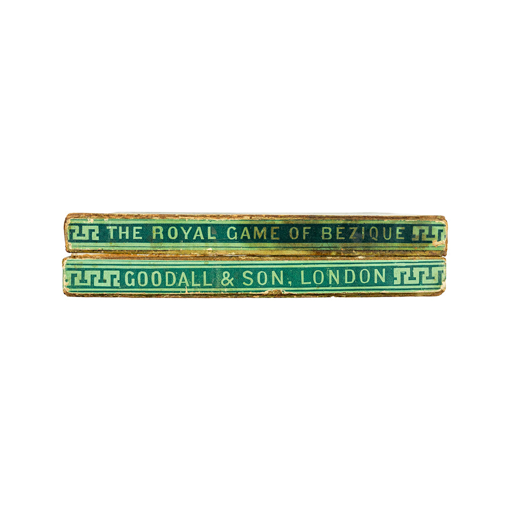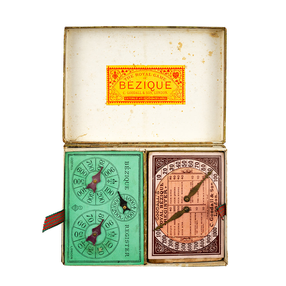 Goodall & Sons aptly named their Bezique sets "The Royal Game of Bezique." This original mid-19th century hinged lid box contains a twin deck (7-Ace) and includes a pair of original scorers and the original rules. According to the V&A Museum, these colourful point markers were available from Goodall & Son in 1868.