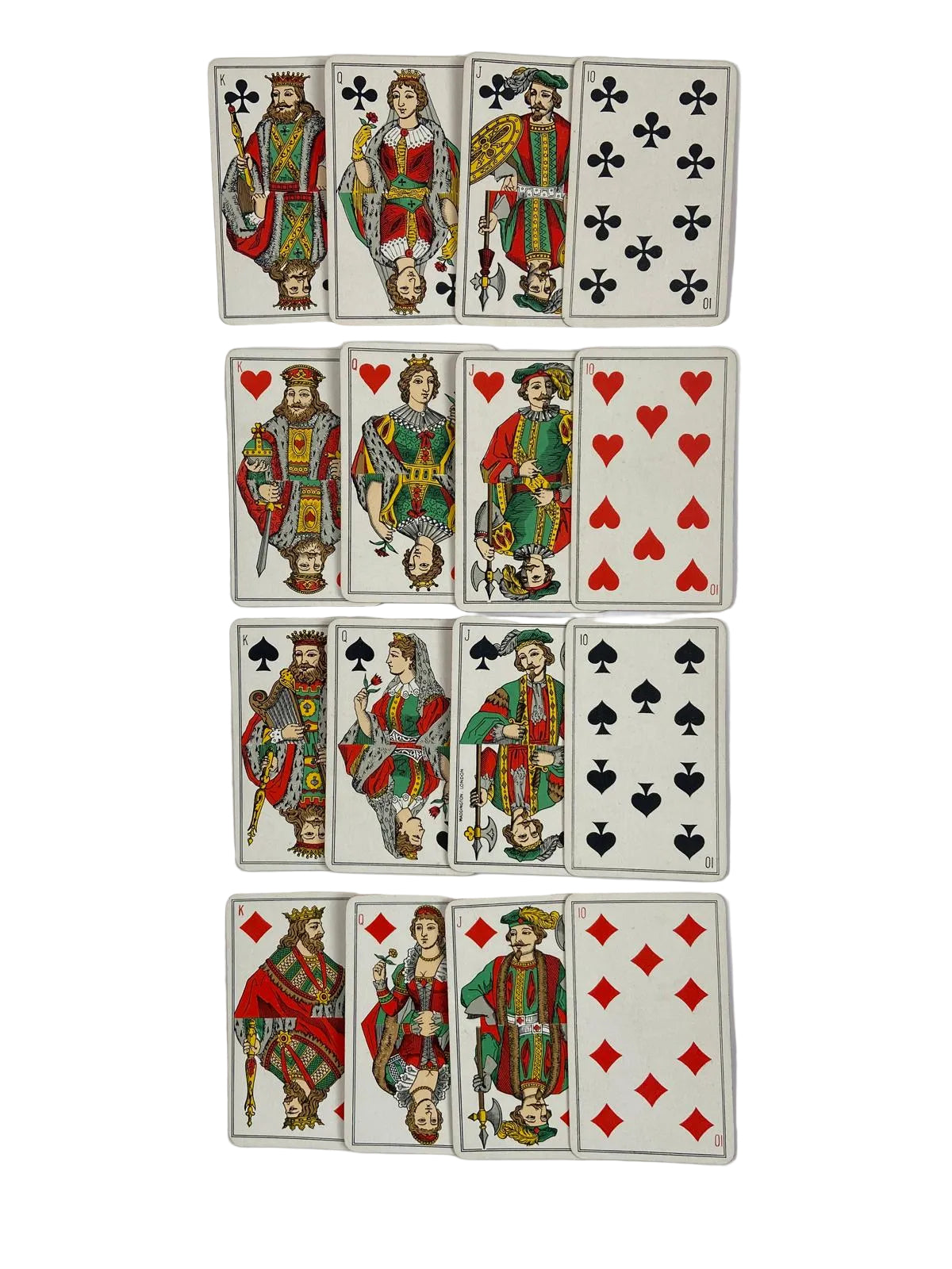 Rare 1930s French-style playing cards by Waddingtons, originally exported to Belgium and France during wartime shortages. Marketed as 'Unique Style Playing Cards' in the UK due to supply constraints. This narrow deck (3.25" x 2") features a Jack of Spades marked 'Waddington London' and comes without jokers - a distinctive characteristic of the period. A highly sought-after collector's piece with authentic historical provenance and exceptional rarity. Missing original box, but presented in clear acrylic case.