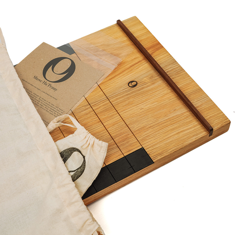 A beautifully crafted shove ha'penny set, complemented by five authentic half pennies to play with - the coins are naturally worn and smoothed providing a lovely glide across the board during play. The board is handmade from solid oak, with a walnut coin stopper - the surface has been hand sanded to a super fine grade, oiled with natural oil to bring out the grain and improve play. Two scoring lanes have been painted with chalkboard paint allowing for ease in chalking up the scores. The nine bays on the board are divided by 1.5 mm deep grooves, which allows for the brass line checker to be used when players are in dispute about whether the coin is within the bay or not. A front oak baton on the underside holds the board solidly in place on a table during play.