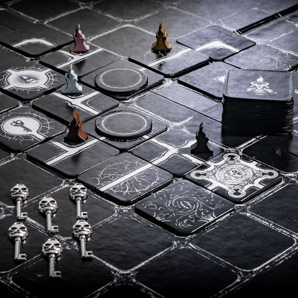 The Night Cage is a co-operative, tile placement game that pits players against a maze-like prison where the only bars are eternal darkness. Due to the limited light of their candles, players can only see the tiles immediately adjacent to them. As players move, the tiles they leave behind disappear into the darkness. In this way, the maze is continually made and unmade by the players. To win, players must rely on teamwork and collective strategy to collect 4 keys, find an exit gate, and escape the labyrinth together.